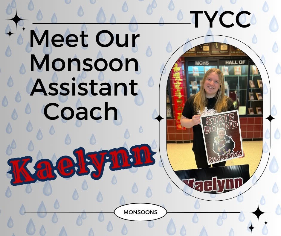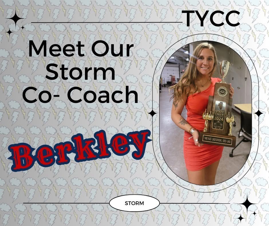 Coach Berkley is kicking off her 4th year of coaching for TYCC and is beyond excited to be the head coach for Storm this season! 💙 She’s been with Storm for 2 years now, previously coaching Cyclones, and has a strong cheerleading background, starting as an All-Star cheerleader at just 7 years old. She continued cheering through high school, where she was a part of the football, basketball, and competition teams! 🏀🏈